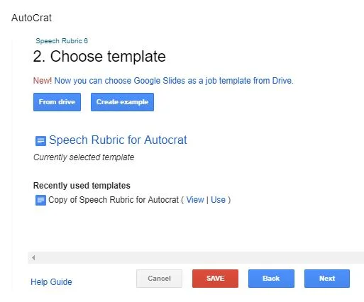 autoCrat will ask you to select a template. Select the Doc template you created earlier from your Drive. Click Next.