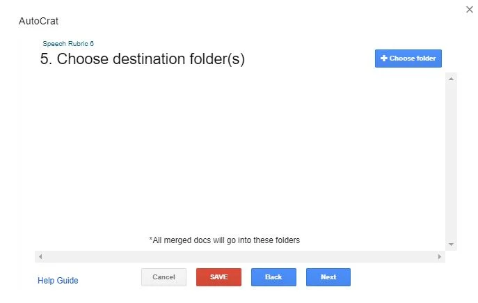 Choose a folder in your Drive where all merged Docs will be sent. Each Doc will be shared with the student, but you'll receive a copy in your Drive as well. You may want to create a new folder for this.
